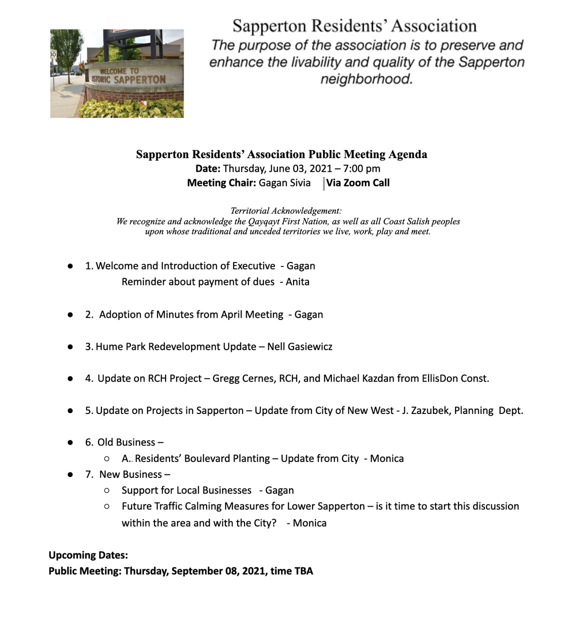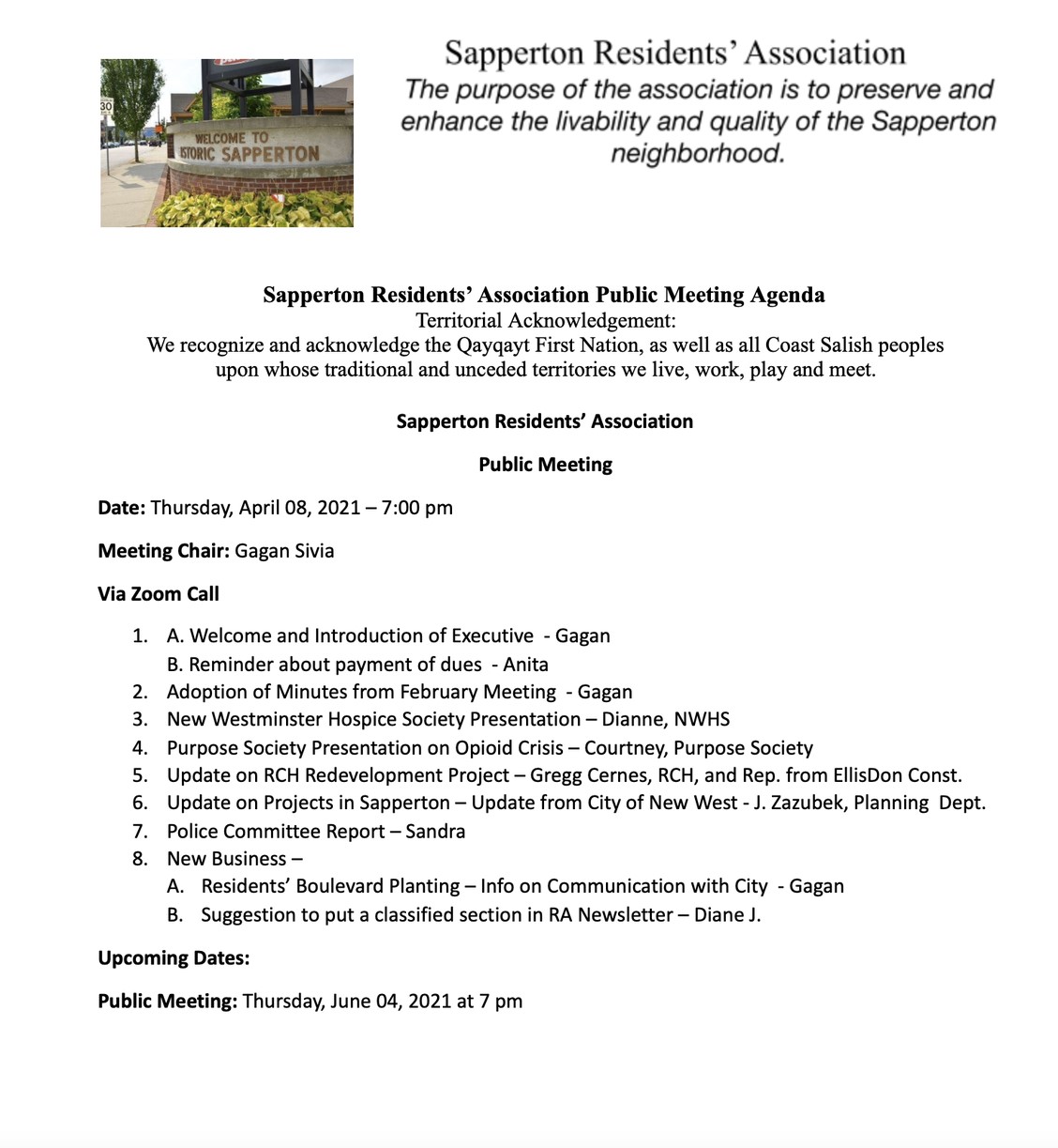 The purpose of this workshop is to discuss concerns and hear feedback on specific elements of the proposed traffic calming design, and take new ideas that can help finetune the proposal prior to presenting it to the City of New Westminster for consideration. Please note that this is the final step in the resident-directed part of this process. We encourage anyone who is interested to participate in the workshop on March 8. If you are unable to do so, you are welcome to provide feedback or ideas via email to SappertonRA@gmail.com. Please also discuss this issue with your neighbours and encourage them to participate in the Workshop. We hope as many residents as possible will be part of this important discussion and have their voices heard. We would like to remind everyone that the SRA is acting as a facilitator and liaison to the City on this initiative, and the participation of the RA should not be seen as an endorsement of this proposal. The RA has not taken any position on this proposal.